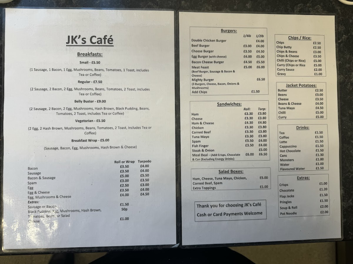 Jk Cafe embraces a diverse menu that caters perfectly to the casual diner and the breakfast enthusiast alike. Their offerings range from hearty sandwiches to comforting jacket potatoes, ensuring you'll find something to tickle your taste buds. For those who revel in breakfast, you'll be thrilled to start your day with their piping hot breakfast wraps, which have received stellar reviews from satisfied customers.